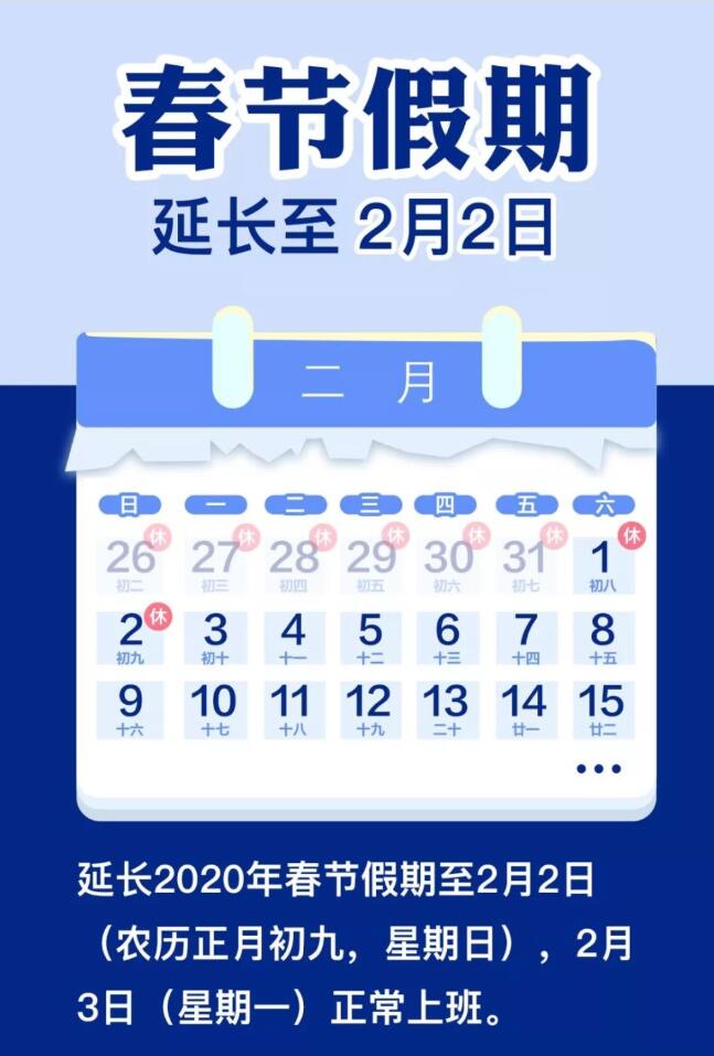 由于受到新型冠狀病毒疫情影響,為保障我司正常上班時車間物料能正常供應,根據(jù)國務院最新通知安排,延長2020年春節(jié)假期至2月2日(農(nóng)歷正月初九,星期日),2月3日(星期一)起正常上班。