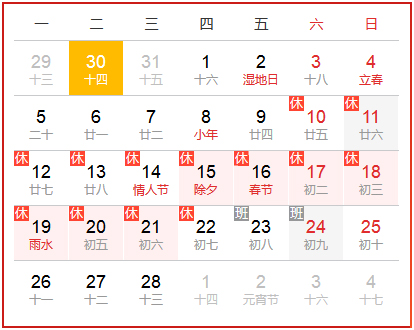 2018年2月10日至2018年2月22日放假,共13天;2月23日(周五)、2月24日(周六)正常上班;放假期間,我們將會(huì)暫停發(fā)貨等人工服務(wù)。 如果在此期間您有貨物發(fā)送安排,請(qǐng)?zhí)崆芭c平和客服經(jīng)理聯(lián)系。