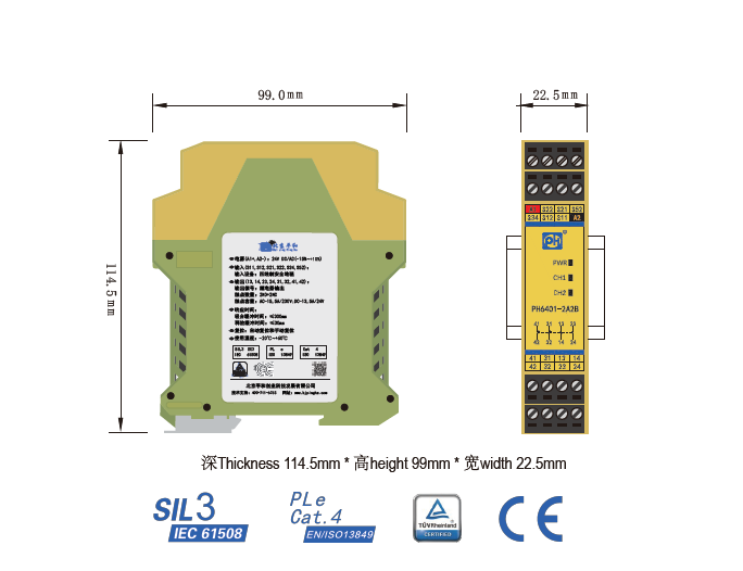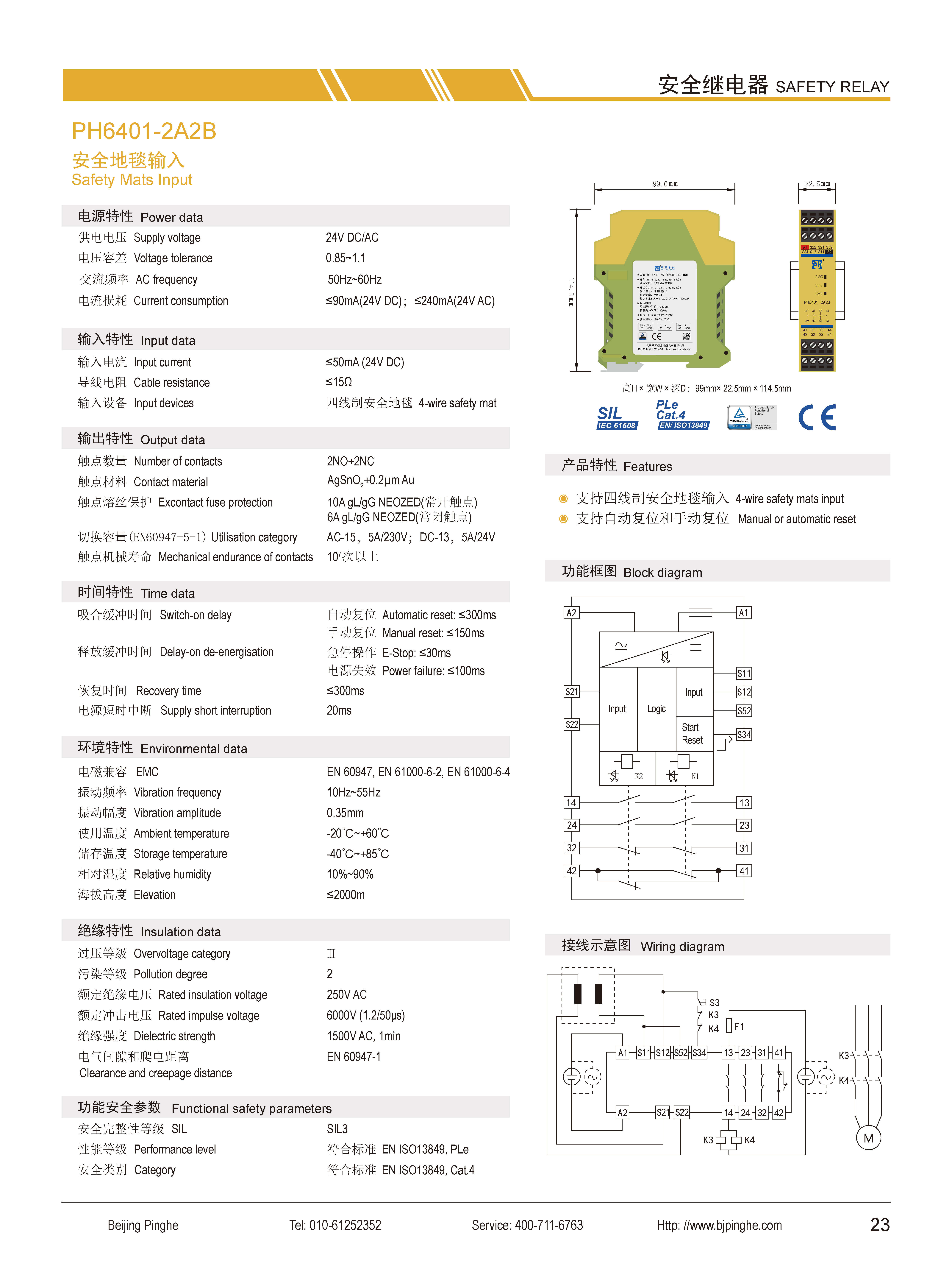 PH6401-2A2B是一款安全繼電器控制模塊,適用于安全地毯輸入,具有2路常開(NO)安全輸出觸點和2路常閉(NC)輔助輸出觸點的安全繼電器。它支持雙通道操作,手動或自動復位功能。
