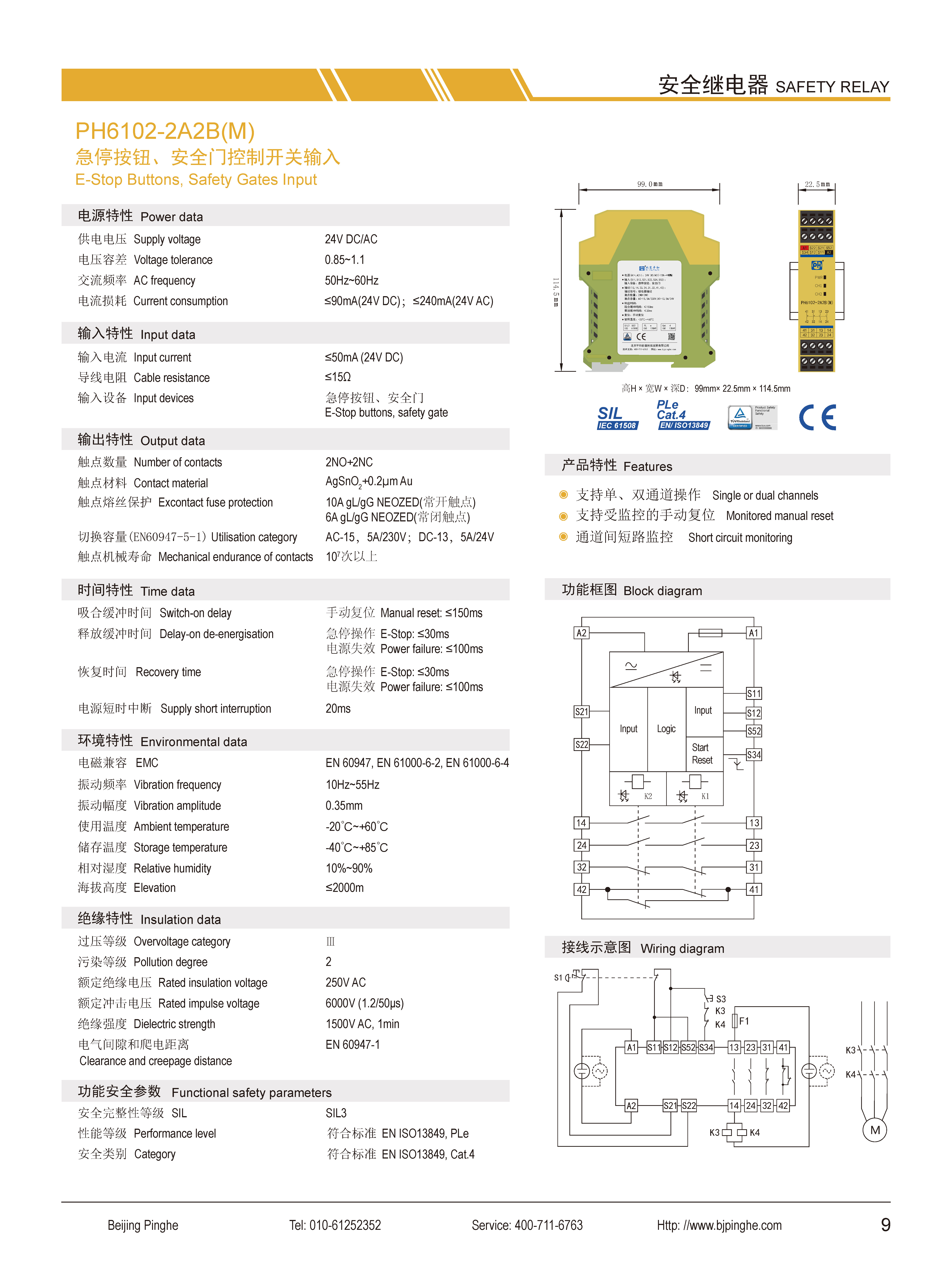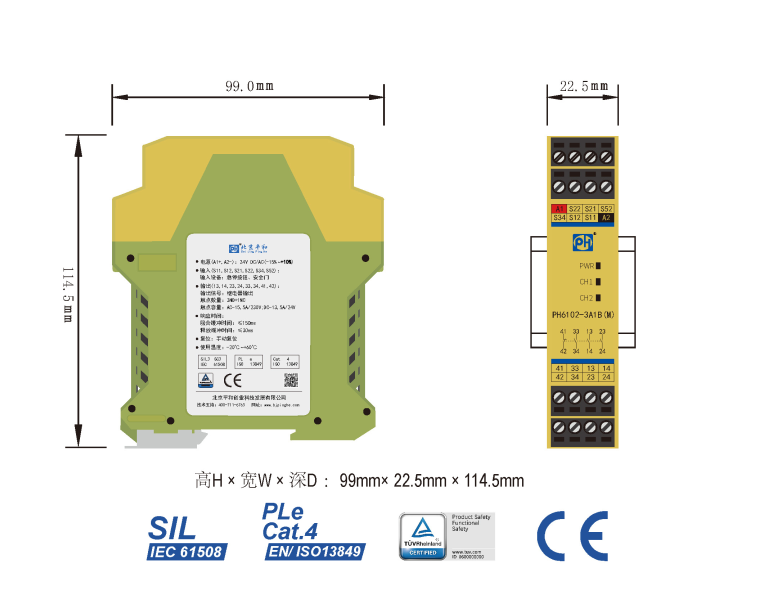 PH6102-3A1B(M)是一款安全繼電器控制模塊,適用于急停按鈕、安全門控制開關(guān)輸入,具有3路常開(NO)安全輸出觸點和1路常閉(NC)輔助輸出觸點的安全繼電器。它支持單、雙通道操作,手動復(fù)位,并具有通道間短路監(jiān)控功能。