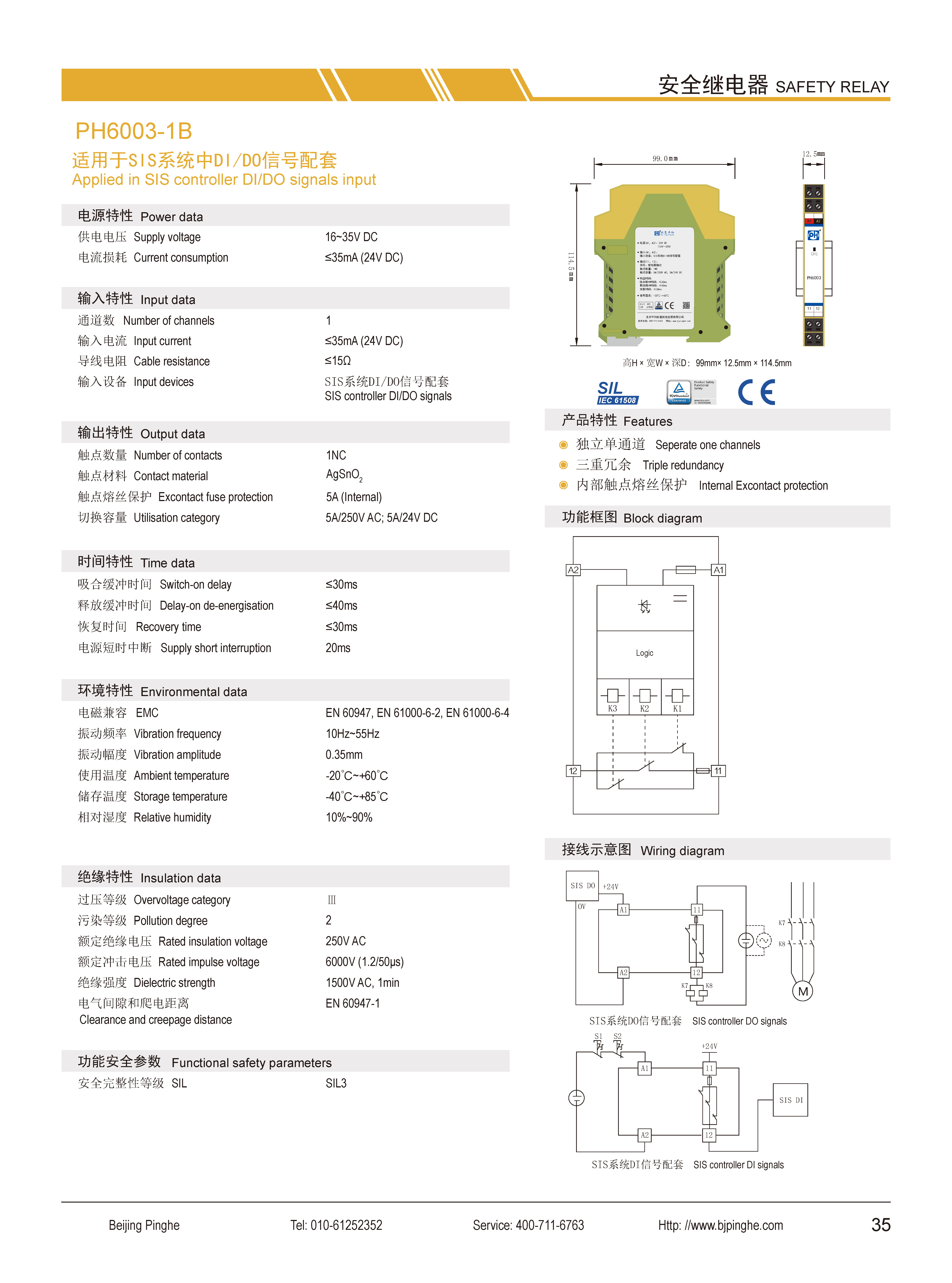 PH6003-1B是一款安全繼電器控制模塊,適用于安全開關(guān)、SIS系統(tǒng)中DO信號隔離轉(zhuǎn)換,具有1路常閉(NC)觸點,內(nèi)部電路采用Fail-safe技術(shù),3重冗余技術(shù)和觸點熔接保護技術(shù)。