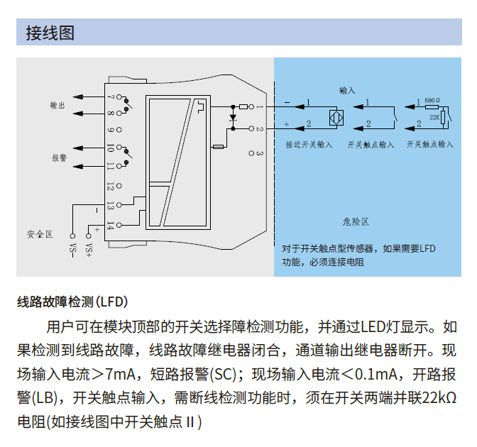 現(xiàn)場(chǎng)輸入電流>7mA,短路報(bào)警(SC),現(xiàn)場(chǎng)輸入電流<0.1mA,開路報(bào)警(LB)