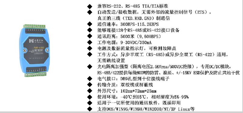 | 工作方式 | 異步半雙工(RS- 485)或異步全雙工(RS-422)通用,無(wú)需跳線設(shè)置 |