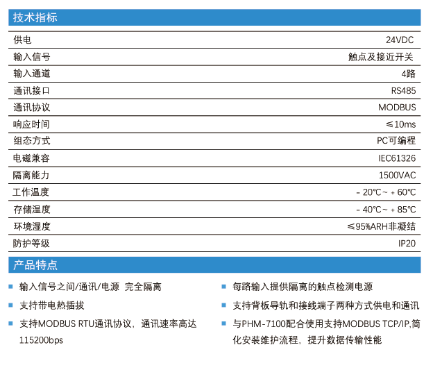 將工業(yè)現(xiàn)場的4路開關(guān)量分別隔離轉(zhuǎn)換為數(shù)字信號,按照MODBUS 規(guī)約,通過RS485通訊方式, 將數(shù)字信號提供給PHM-7100,PLC或上位機(jī)等控制器或數(shù)據(jù)采集系統(tǒng)。完善的隔離設(shè)計理念非常適合工業(yè)現(xiàn)場的復(fù)雜工況,長期穩(wěn)定性好,每路提供隔離的觸點檢測電源,增加了觸點檢測的可靠性、抗干擾性能優(yōu)異。