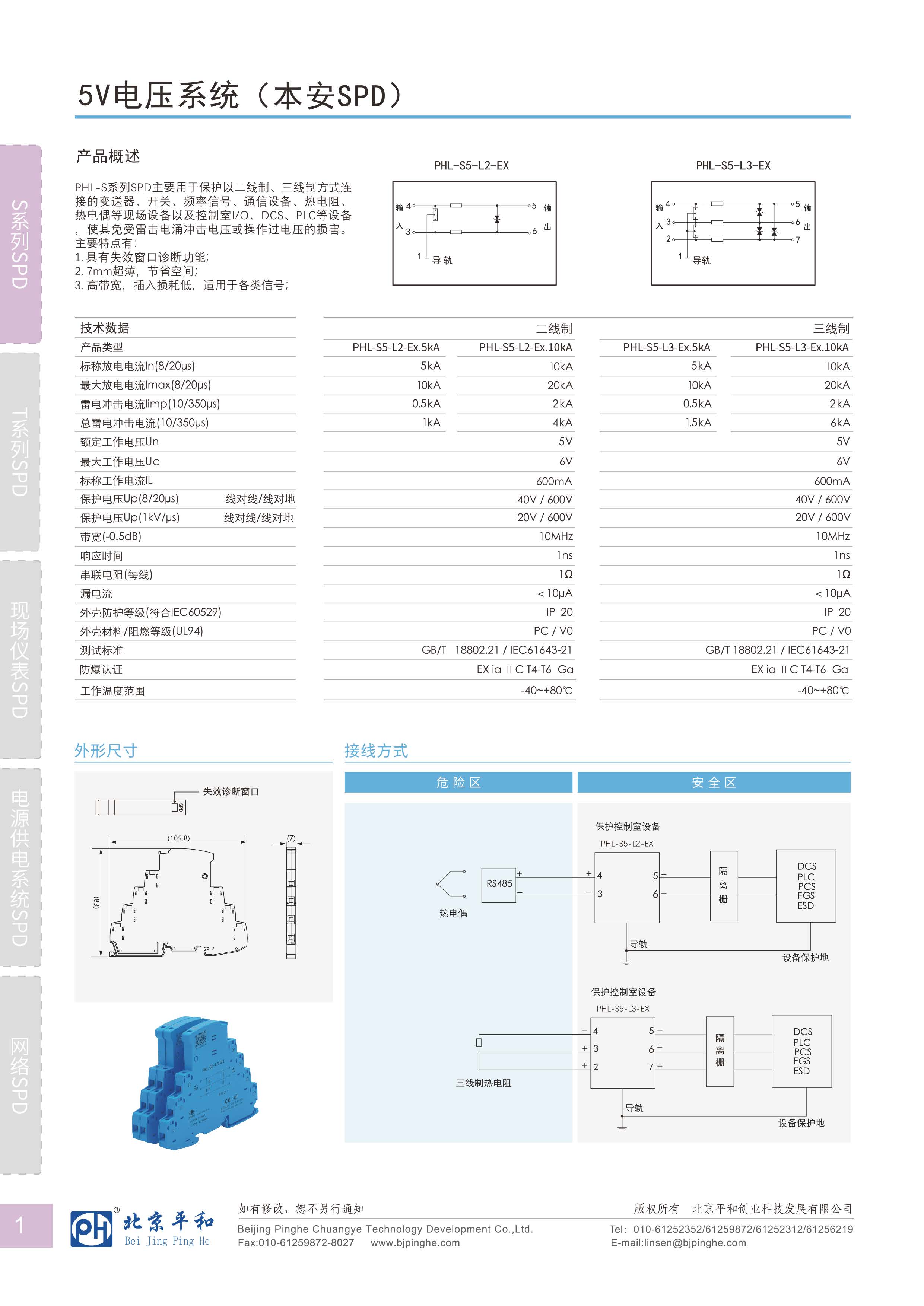PHL-S系列SPD主要用于保護以二線制、三線制方式連接的變送器、開關(guān)、頻率信號、通信設(shè)備、熱電阻、熱電偶等現(xiàn)場設(shè)備以及控制室I/O、DCS、PLC等設(shè)備,使其免受雷擊電涌沖擊電壓或操作過電壓的損害。主要特點有: 1.頂部具有狀態(tài)報警顯示功能; 2.7mm超薄,節(jié)省空間; 3.高帶寬,插入損耗低,適用于各類信號;
