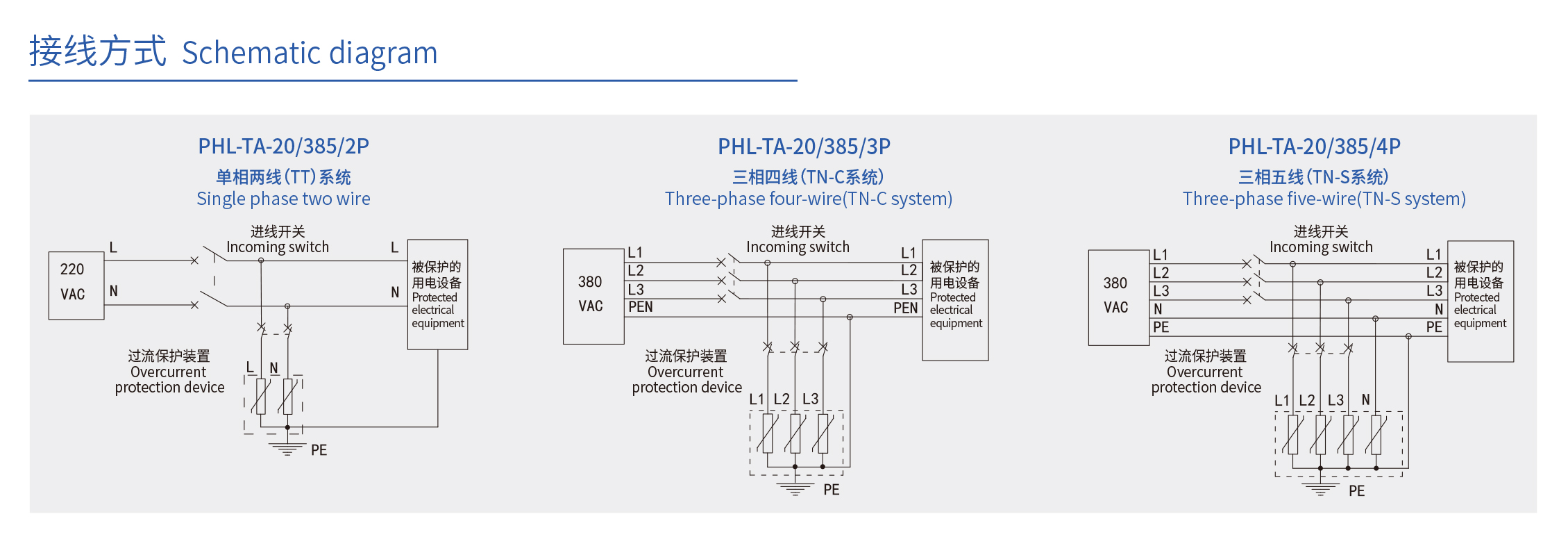 用第三級的電源浪涌保護器,適合安裝在各類供電電源的終端配電箱,以及其他LPZ2區(qū)與LPZ3區(qū)和后續(xù)分區(qū)的交界處。
