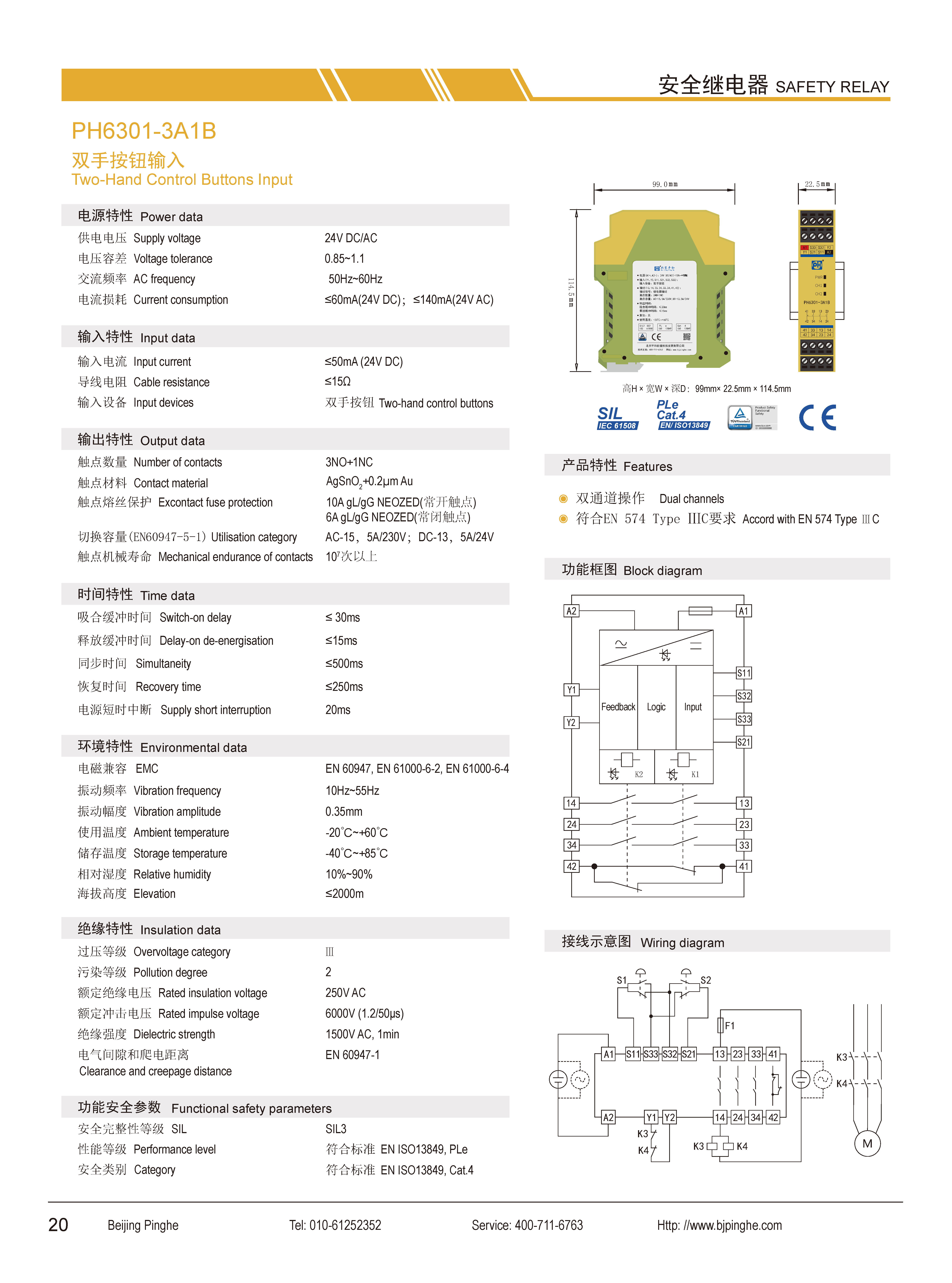 PH6301-3A1B是一款安全繼電器控制模塊,適用于雙手按鈕輸入,具有3路常開(NO)安全輸出觸點(diǎn)和1路常閉(NC)輔助輸出觸點(diǎn)的安全繼電器。它具有雙通道輸入模式,自動(dòng)復(fù)位,并具有不超過(guò)0.5s的同步檢測(cè)功能。