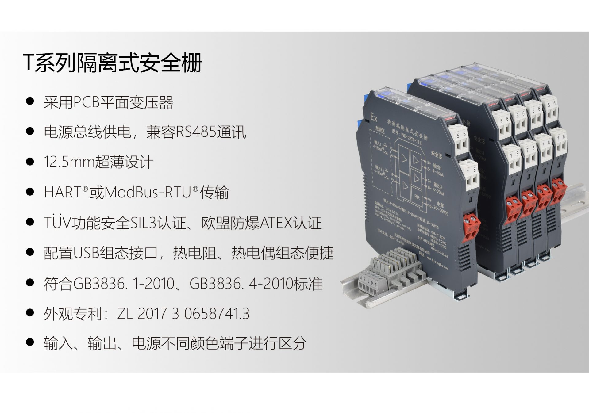 北京平和T系列智能型隔離式安全柵是本質(zhì)安全型儀表防爆結(jié)構(gòu),應(yīng)用于工藝控制參數(shù)要求高、干擾幅度大及干擾頻繁的場(chǎng)合。產(chǎn)品采用PCB平面變壓器和領(lǐng)先的低功耗設(shè)計(jì),12.5mm超薄外觀,符合GB3836.1-2010和GB3836.4-2010標(biāo)準(zhǔn),獲得德國(guó)萊茵TÜV功能安全SIL3等級(jí)認(rèn)證、歐盟防爆產(chǎn)品ATEX認(rèn)證及IECEx國(guó)際電工委員會(huì)防爆電氣產(chǎn)品認(rèn)證等。