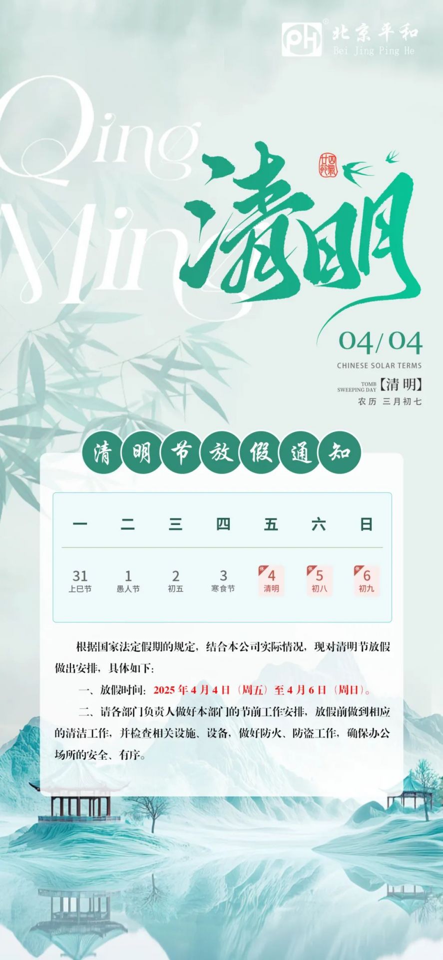 發(fā)布人:北京平和市場(chǎng)部 發(fā)布時(shí)間:2025-04-03 關(guān)鍵詞:北京平和 清明節(jié) 放假通知