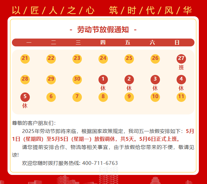 2025年勞動節(jié)即將來臨,根據(jù)國家政策規(guī)定,我司五一放假安排如下:5月1日(星期四)至5月5日(星期一)放假調(diào)休,共5天。5月6日正式上班。